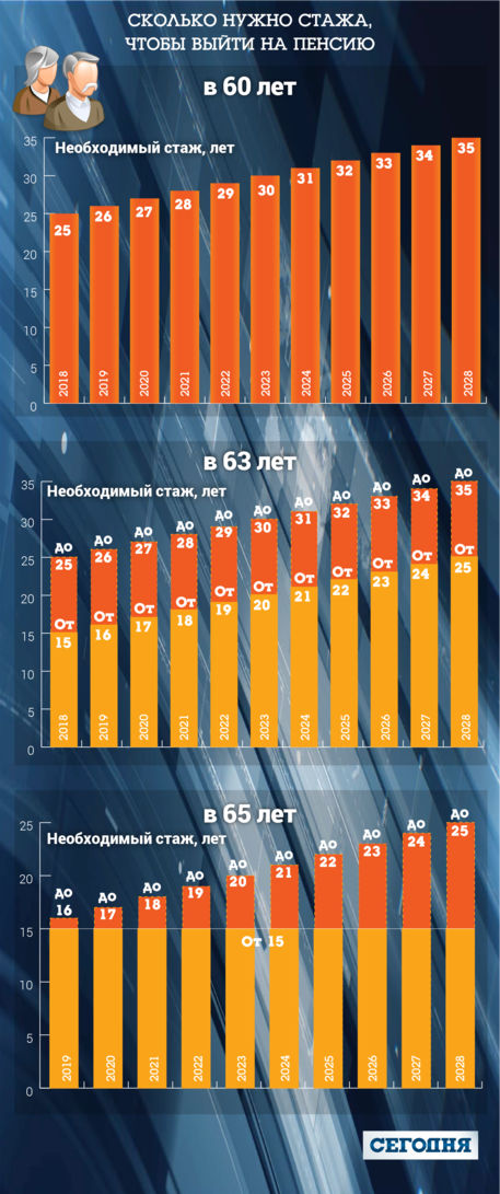 Минимальное требование для получения пенсии в 65 лет не меняется, его закрепили на уровне 15 лет. А вот требования для пенсии в 63 и 60 лет будут расти 10 лет, увеличиваясь с каждым годом на 12 месяцев. Так, в следующем году в 60 лет получить свою пенсию смогут украинцы с 25 годами стажа, а к 2028-му нужно отработать как минимум 35 лет.