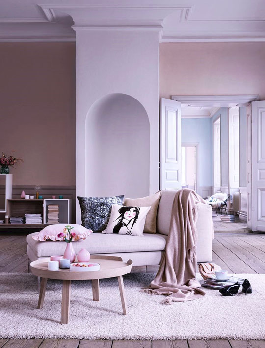 Холодный ровный оттенок розового «к лицу» многим интерьерам. Комнаты, оформленные в стилях лагом и рустик, становятся более элегантными и благородными, если добавить правильный розовый цвет. Приглушенные, дымчатые, словно пыльные тона едва обозначенного розового цвета гармоничны в таких интерьерах.