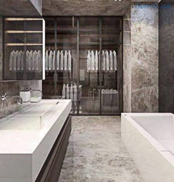 Два умывальники с общим стоком — стеклянным параллелепипедом. Одежный шкаф-купе со стеклянными створками.